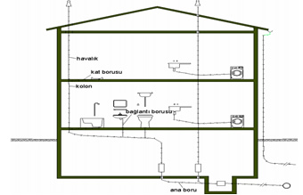 . İç Pis Su Tesisatı:Su kullanma yerlerinden gelen kirli suları binaların 1,0 – 1,5 m dışına kadar taşıyan tesisata iç pis su tesisatı denir. Bina içi atık su tesisatı; boru bölümlerinin görevleri dikkate alınarak ana boru, kolon, kat borusu, bağlantı borusu, havalık borusu olmak üzere beş bölümde incelenir. kaynk:http://hbogm.meb.gov.tr/modulerprogramlar/kursprogramlari/sanat/moduller/su_tesisat_projeleri.pdf